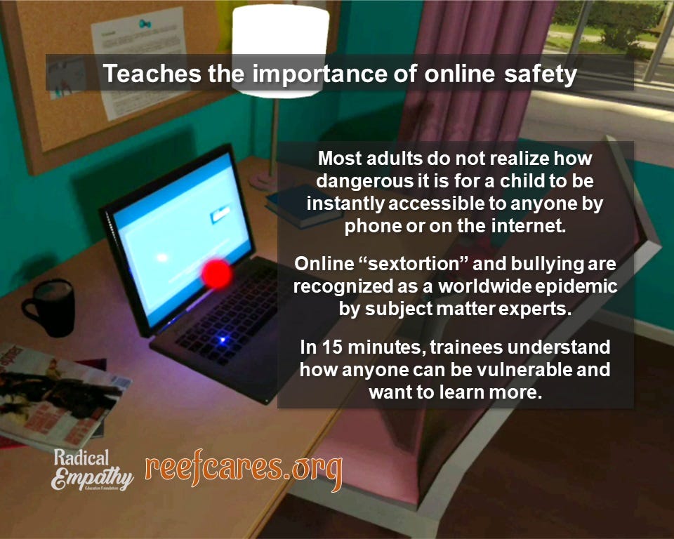 Radical Empathy Education Foundation is a nonprofit organization dedicated to preventing abuse and human trafficking through innovative, immersive VR technology. Their award-winning training tools educate users on the tactics predators use and empower individuals to recognize and avoid abusive situations.