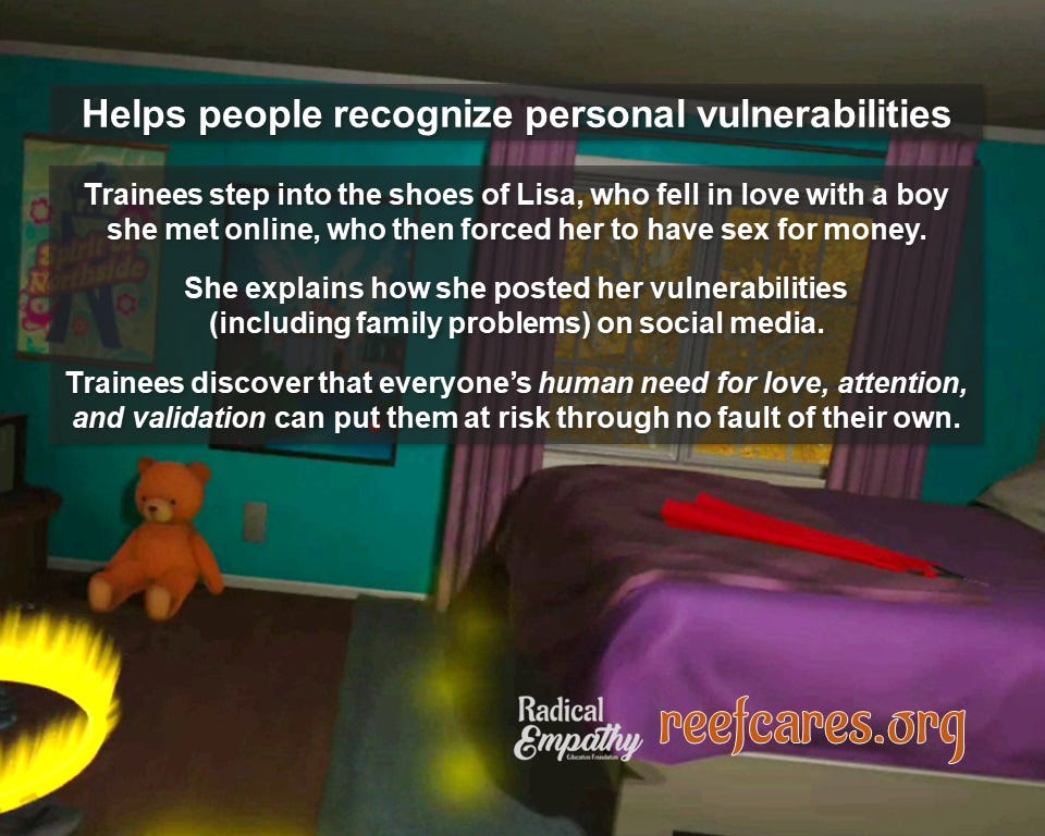 Our VR experience allows trainers to use Lisa's interactive story as a bridge between trainees and survivors’ stories. This approach protects lived-experience educators from being re-injured while still creating an emotionally impactful learning experience. When trainees remove the headset, they have a newfound understanding of how anyone can be deceived and manipulated. Trainers can then build on that foundation, sharing as much or as little personal experience as they choose